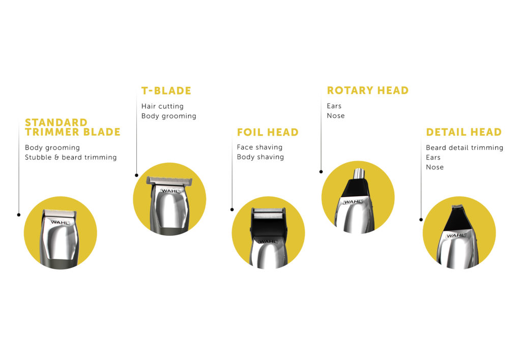 • 5 interchangeable heads: Standard Trimmer Blade, T-Blade, Foil Head, Rotary Head, Detail Head