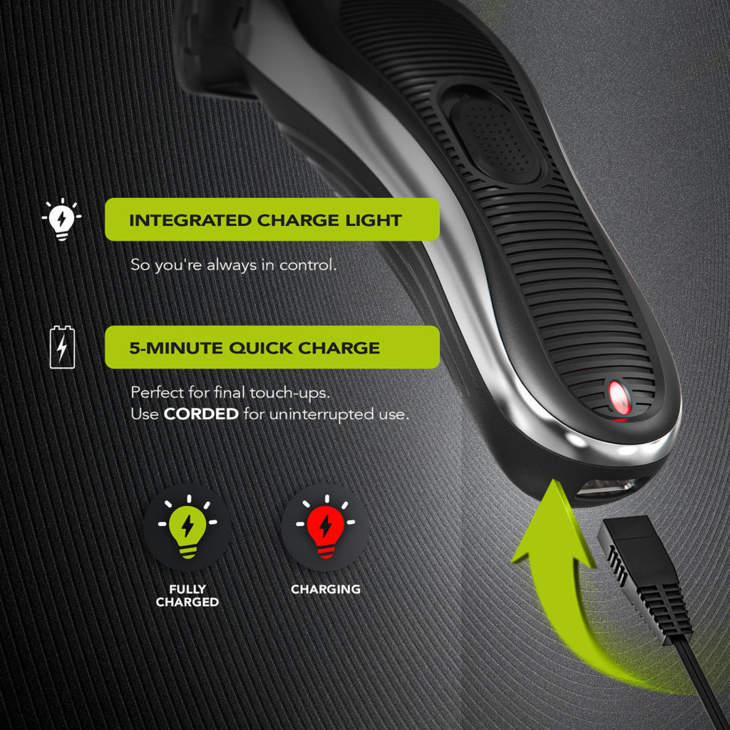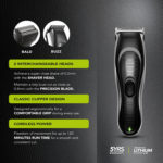 The Wahl Bald and Buzz Cut (Model 9649) is the ideal grooming tool for shaving heads and performing buzz cuts. It can be used with or without the cord, offering freedom of movement with a 120-minute cordless run time.