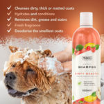 This professional shampoo is perfect for very thick, smelly, matted coats to thoroughly cleanse and effectively deodorise. The shampoo contains natural ingredients, including extracts of peach, pear, passion-flower and kiwi fruit to give a fresh, fruity, long-lasting scent that helps to eliminate all odour.