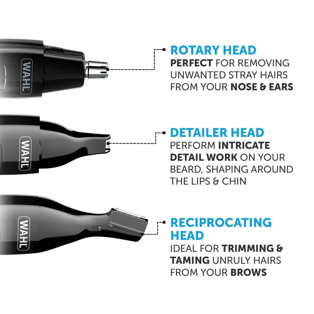 The Wahl Ear / Nose / Brow Trimmer is a rechargeable personal trimmer is the ideal grooming accessory featuring three cutting heads.