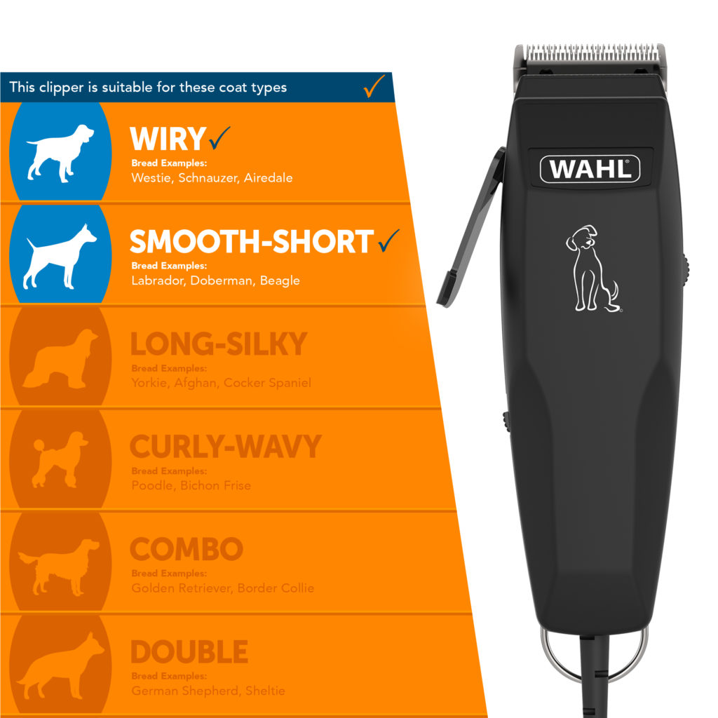 The Wahl Pet Starter Dog Clipper Kit is a mains operated dog clipper that is specifically designed for clipping dog hair at home and will maintain wiry, smooth and short coats.