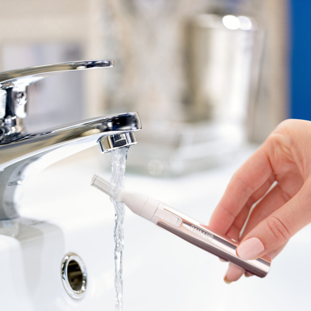 The Wahl Eyebrow Precision Trimmer is a compact battery-operated trimmer for quick and painless hair removal, sized to trim intricate areas such as eyebrows and upper lip.