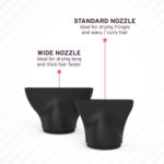 This salon style dryer includes a standard nozzle that is essential for drying fringes and wavy / curly hair and wide concentrator nozzle that is ideal for drying long and thick hair faster.